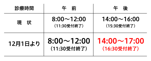 上記の通り、令和4年12月1日より診療時間を変更させていただきます。